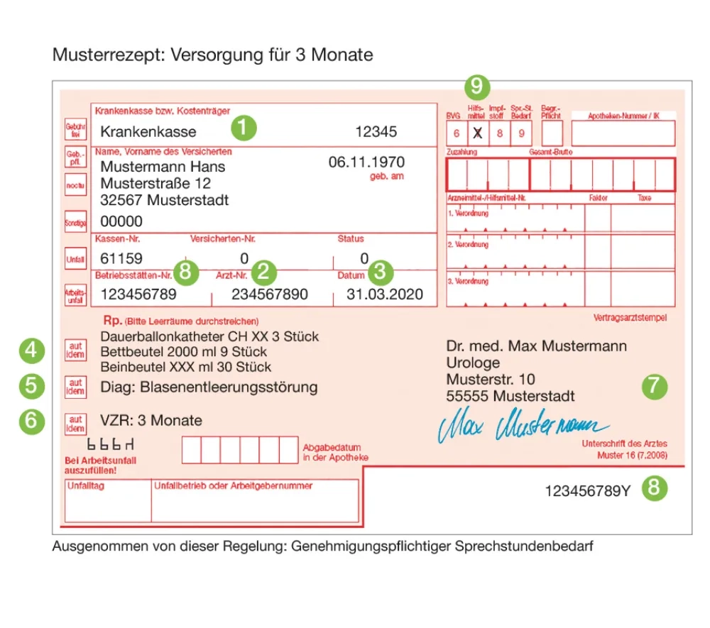 Krankenkassen rechnen nach Stückzahlen, nicht nach Packungsgrößen. Geben Sie die genaue Menge des Hilfsmittels an, z. B. „10 Katheter“ statt „1 Packung“.